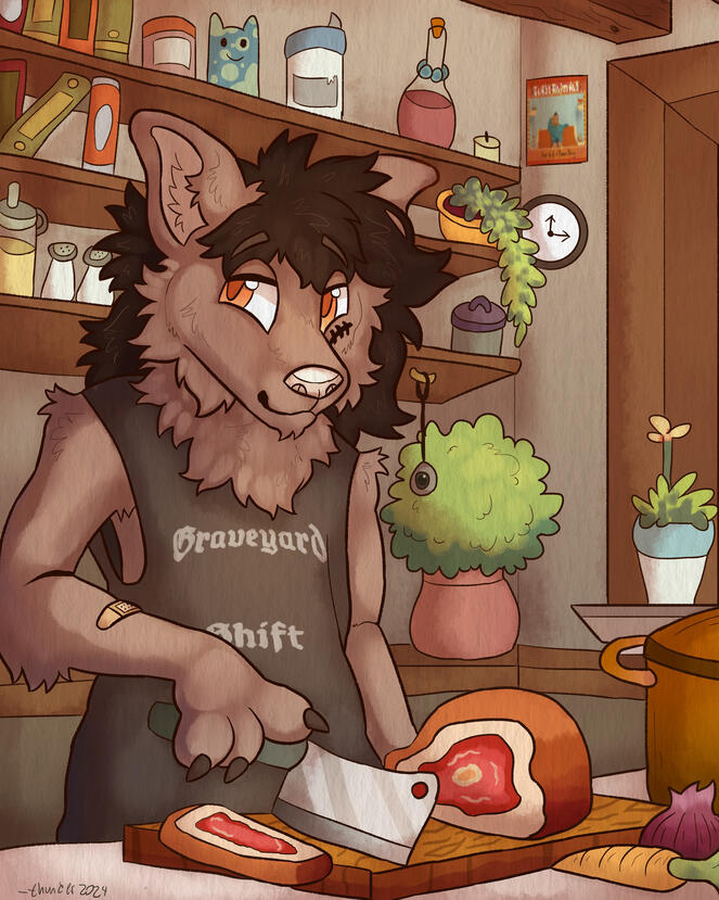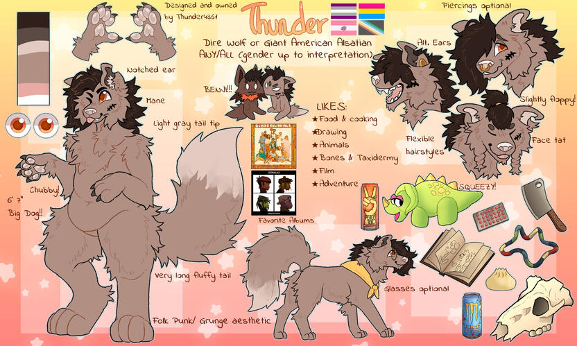 A detailed look into a character. Includes multiple drawings, inventory, color palette, etc. Unrendered.